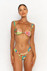 The Soriya in Posidonia by Sommer Swim is a balconette bikini top with a unique gold embellishment at the centre, ruched side detailing, uniquely shaped straps that sit on the shoulder and an embossed gold clip closure.